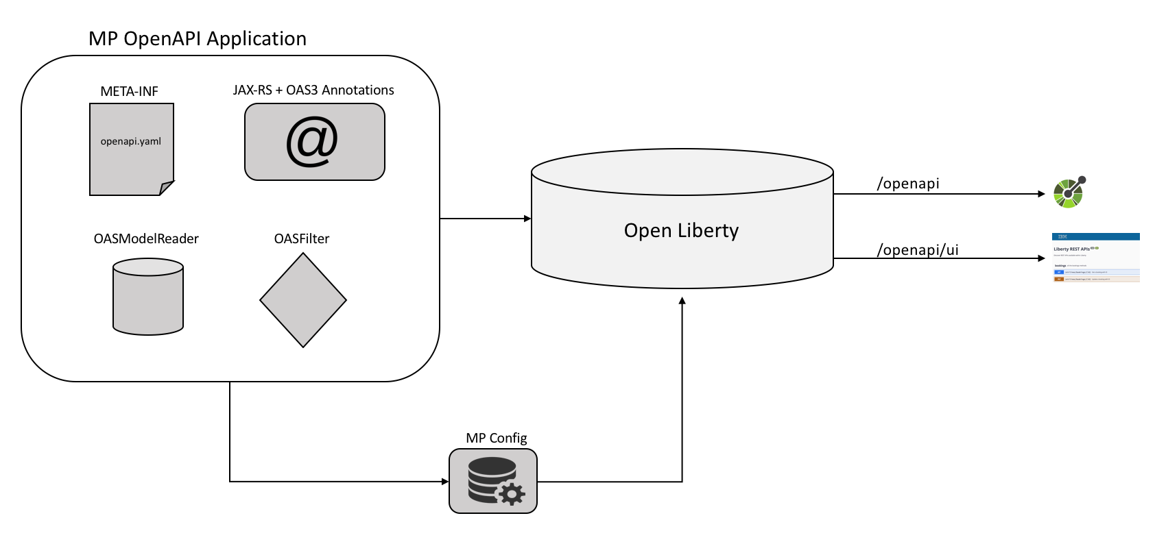 The following diagram provides an overview of the MicroProfile OpenAPI support in Open Liberty, via the mpOpenAPI-1.0 feature.