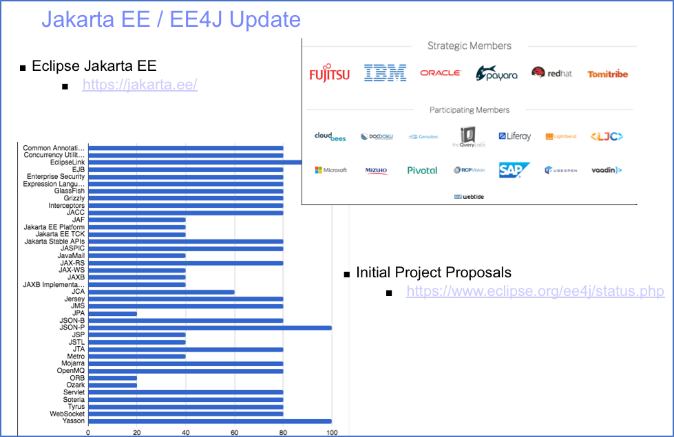 Some explanation for naming fans: Jakarta EE is the working group name at Eclipse, while EE4J is the top-level project name for code and materials developed at Eclipse for Jakarta EE. Many times, these two terms could be used synonymously but the brand name we use is Jakarta EE and code in the EE4J projects provide APIs, docs and implementations. It’s intended that there will be multiple independent implementations of Jakarta EE across a variety of open source organizations and projects so the code projects at Eclipse are gathered under a project name, ee4j, that is distinct from the brand name (Jakarta EE).