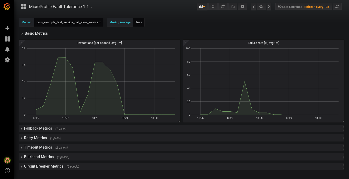 This dashboard shows a selection of graphs for a single method at once. Unless the method is annotated with every Fault Tolerance annotation, some of these graphs won’t apply to that method and will be blank. Since it only shows metrics for a single method, the dashboard isn’t very good for showing an overview of the whole system, but it does let you browse through all the available details when you’re trying to track down the cause of a problem and serves as a useful set of examples for building your own graphs and dashboards.