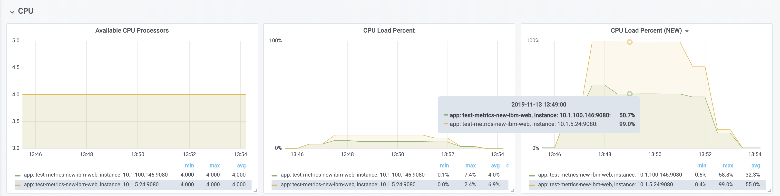 The new processCpuTime metric is displayed on the /metrics endpoint with the MicroProfile Metrics 2.0 and 2.2 features. On the dashboard, a new panel can be created with the following PromQL query: (rate(base:cpu_process_cpu_time[2m])/1e9) / base:cpu_available_processors{app=~}. View full dashboard.