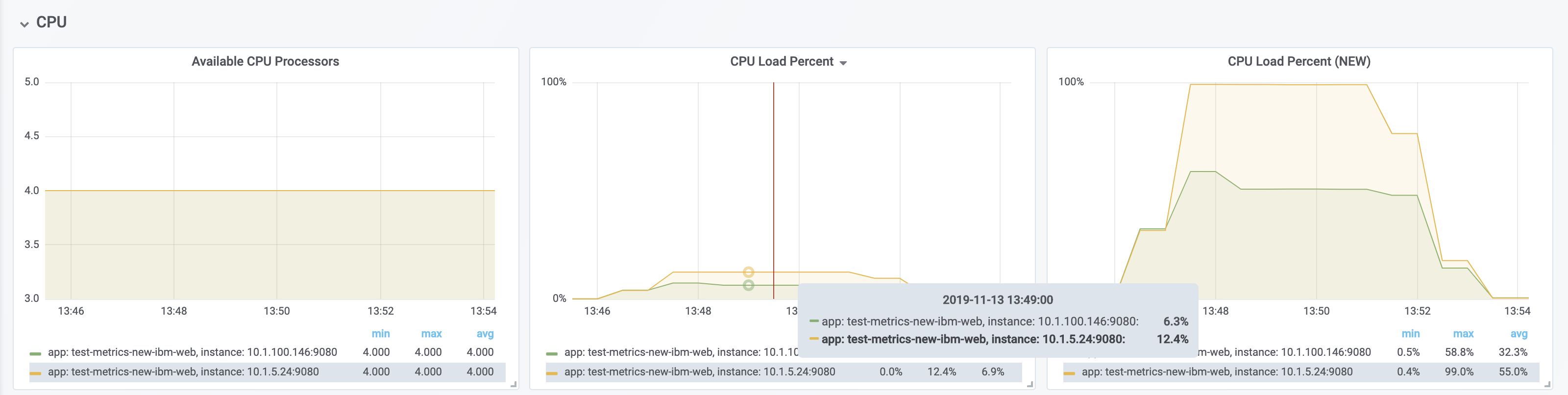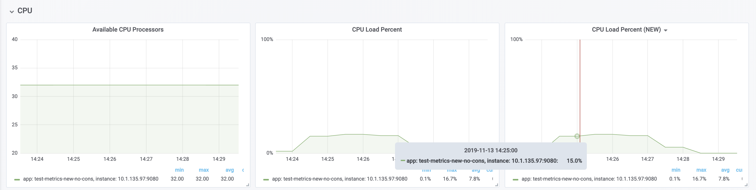 The following images show that the old metric, processCpuLoad, plateaus at 12.5% (4/23), while the new metric, processCpuTime, more accurately represents the percentage of CPU used.