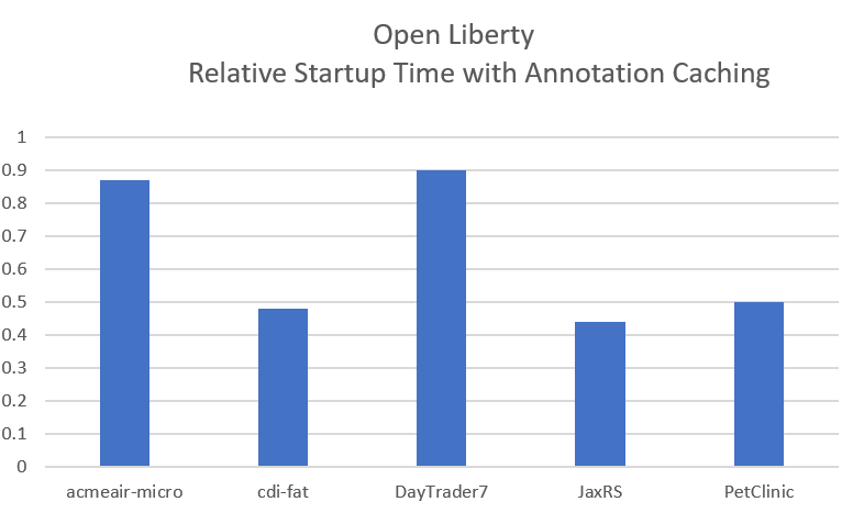 Application startup time is now faster due to adding annotation caching to the core class and annotation scanning function. Depending on application characteristics, startup times are reduced by 10% to more than 50%. Applications with many jar files, or which use CDI or JAX-RS functions, see the best improvements: