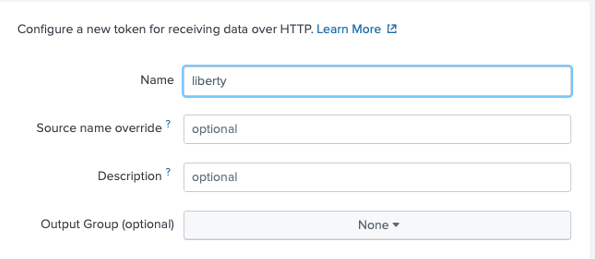 Create the Splunk HTTP Event Collector data input token. In the Splunk Web Interface, go to Settings → Data Inputs → HTTP Event Collector → New Token. Enter a name for the HTTP Event Collector and leave the other fields unchanged. In this example, we named the HEC "liberty". Click Next.