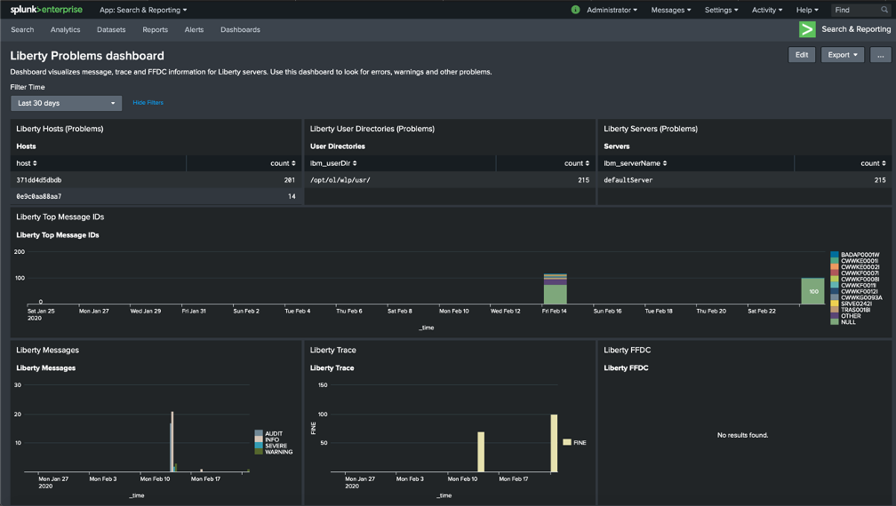 You can collect the aggregated log events from the Open Liberty Docker container into visualizations, which provide real-time information at a glance. I created a sample Open Liberty Splunk dashboard that you can download from GitHub. You can use this dashboard to visualize message, trace, and first failure data capture (FFDC) logging data collected from JSON logging in Open Liberty.