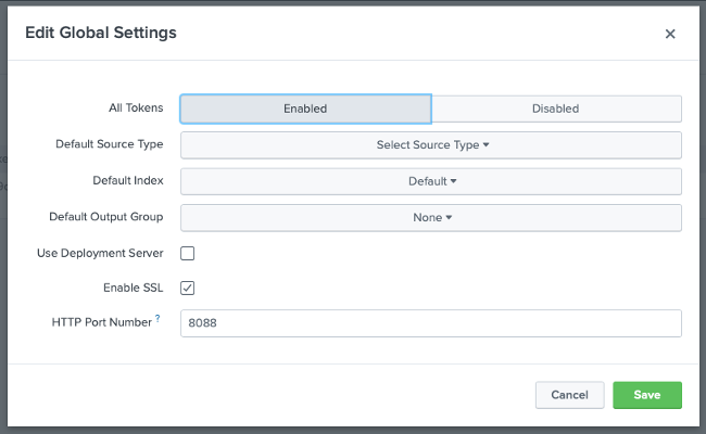 All Tokensfield, click Enabled and check the Enable SSL checkbox, if these options are not already selected. These options ensure the port 8088 for HTTP Event Collector is secured and is using the Splunk default certificate.