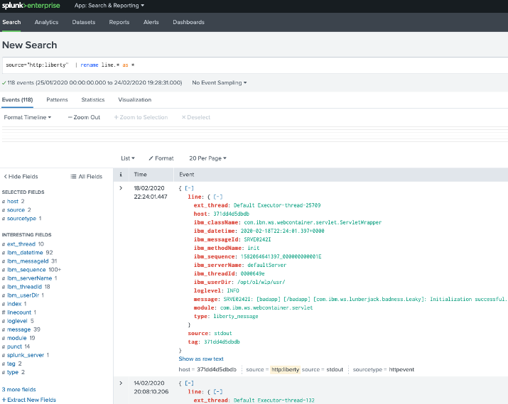 In the Splunk Web Interface, navigate to App → Search & Reporting. Use the following query to search for all the log entries that are from the HTTP Event Collector named liberty, with the line. prefix removed from the interesting fields. The log events can be further filtered with the desired timeframe and the log information fields, as needed.