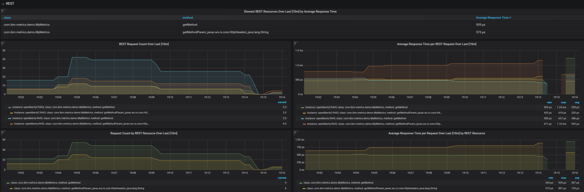 The following image shows Grafana REST dashboard visualizations that we’ll explore in the following sections: