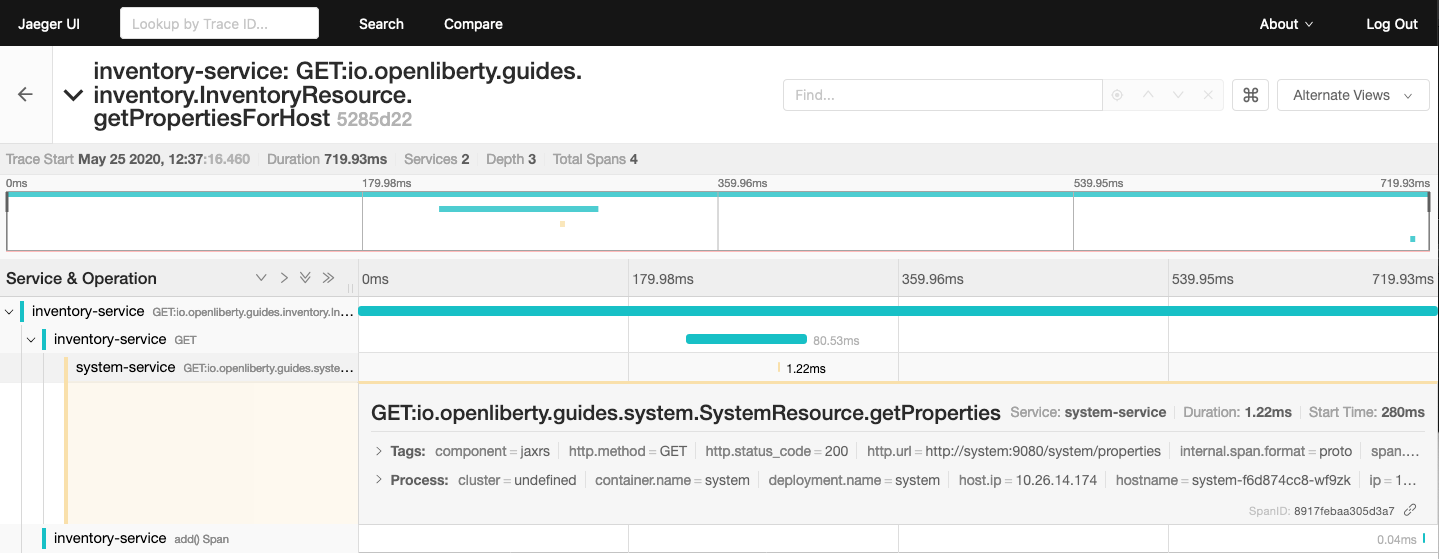 Now we need to deploy a sample application that can create some trace spans for us to test. Open Liberty supports OpenTracing and Jaeger natively so you can write applications using MicroProfile OpenTracing which automatically generate traces using annotations, as described in Open Liberty’s Enabling distributed tracing in microservices with Jaeger guide.