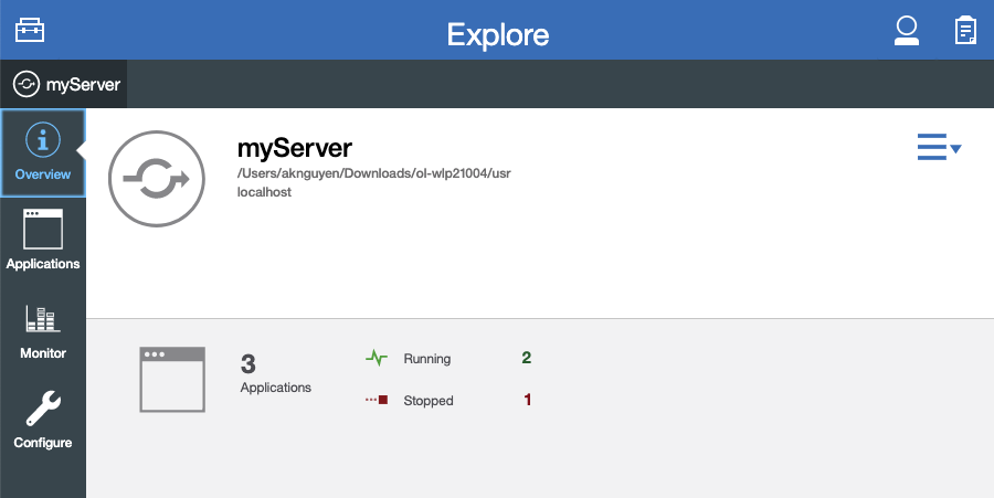 You can use the Explore tool to explore and manage resources in the Open Liberty topology. This tool offers options to view information about the server and its applications. You can also use it to stop, start, or restart resources.