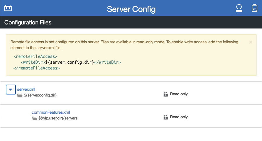 Before you can edit files, the tool prompts you to add a remoteFileAccess element to the server.xml file. You can copy the example element from the browser window or configure it manually. If you do not add this element, configuration files are shown in read-only mode.
