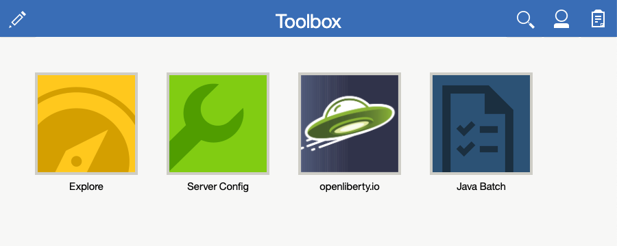 The following tools are available for Admin Center. The Server Config and Explore tools are available by default. The Java Batch and Open ID Connect tools are available only if you enable and configure the respective Open Liberty features for those functions. To use a tool, select its Toolbox icon.