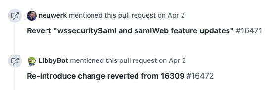 When a PR has been reverted, you might see a pair of updates in the PR that look like the following example, which shows the commit that reverted the PR and the issue that reintroduced the changes: