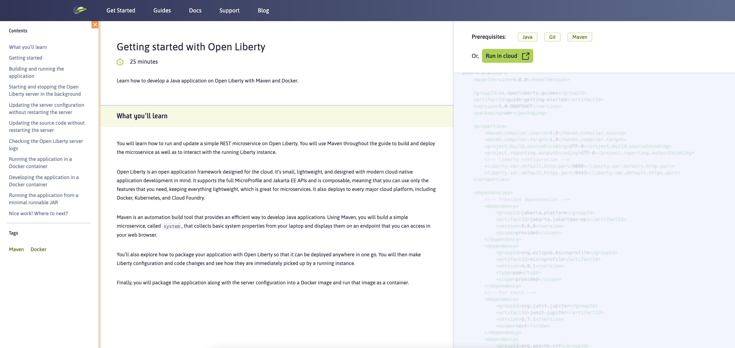 Our team of engineers have been hard at work creating new content for developers to enjoy. We now have 57 different guides on a range of topics covering development, build, testing, and deployment of cloud-native Java applications and microservices. These help developers quickly get started learning various Java and cloud technologies with Open Liberty. Excitingly, you can now run our guides in a hosted environment, without having to worry about local setup and prerequisites. You can access these cloud-hosted guides by going to our guides page, selecting a guide, and clicking the Run in cloud button, as shown in the following image: