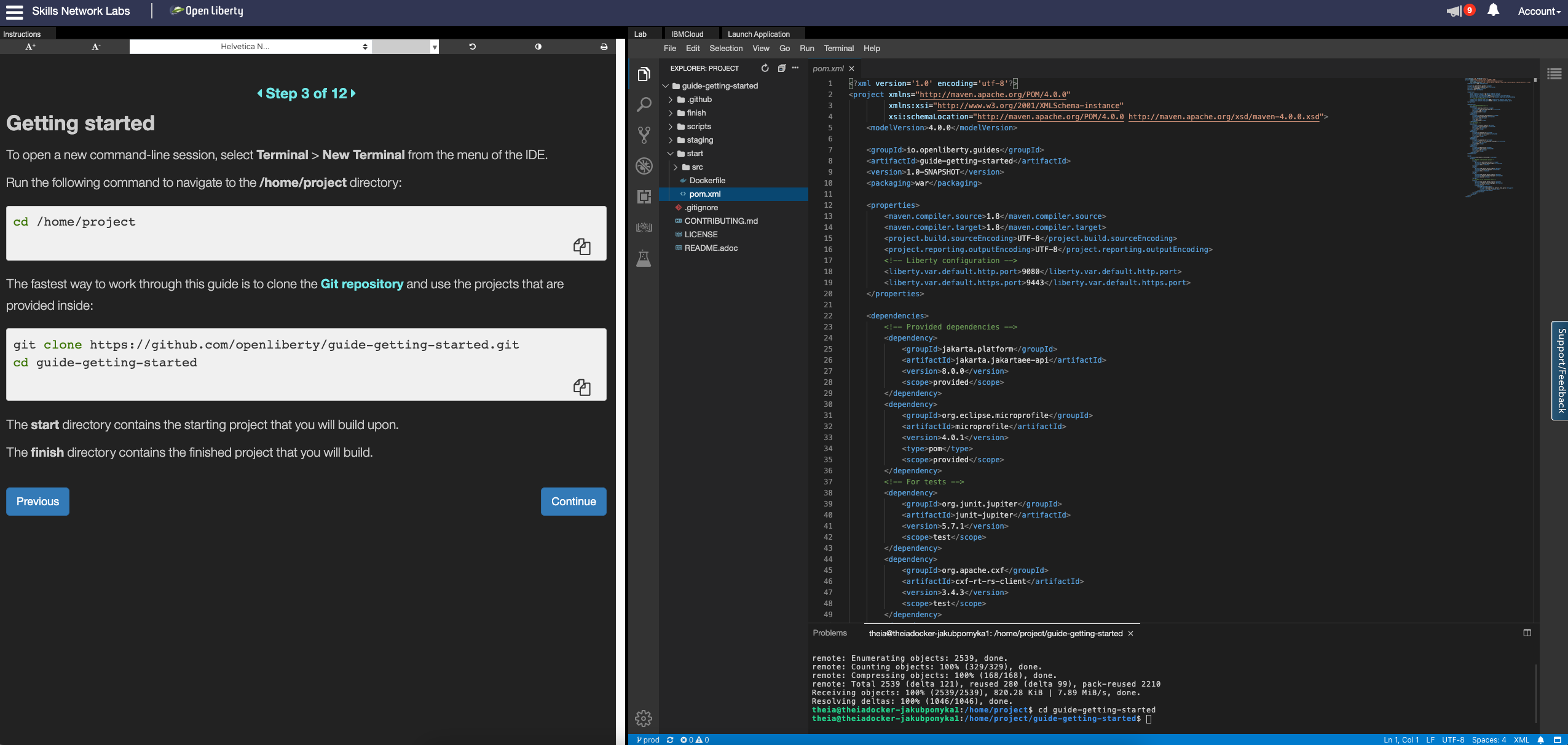 that will allow you to navigate through your project and open files in the IDE, once you have cloned down the repo for the guide. Maven, Gradle, Docker, and Kubernetes are all available in the terminal with their normal respective commands.