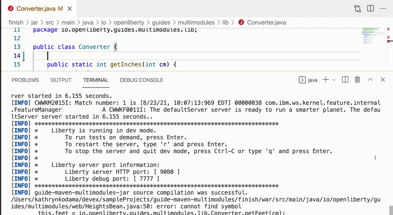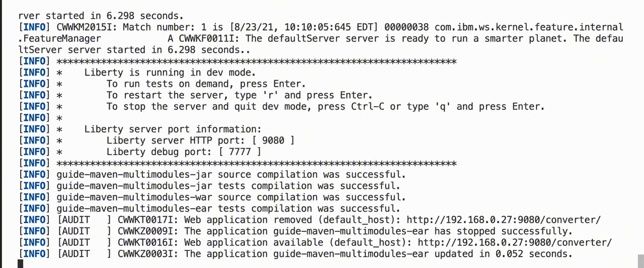 For more details on how to use dev mode with multi-module projects, see the documentation for multiple modules in the Liberty Maven plug-in’s dev goal.