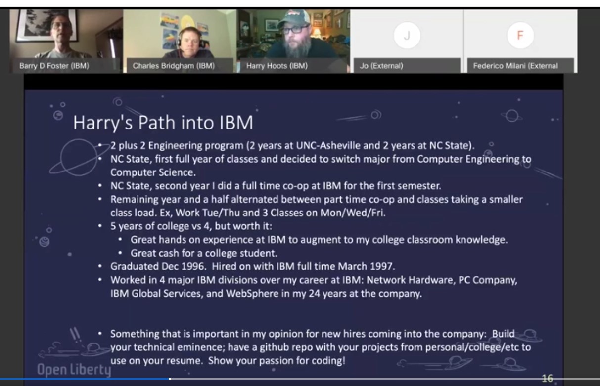 Greetings, my name is Harry L. Hoots, III. I grew up in the Western portion of North Carolina in the Blue Ridge Mountains. I attended UNC-Asheville for my first 2 years of college, then transferred to North Carolina State University (NCSU) via the 2+2 Engineering program. I’ve been with IBM for 24+ years of full time and 1.5+ years of co-op time. I’ve been writing Java code for over 20 years since my first introduction to it in college. In recent years, I’ve helped with the RTP Lab’s Developer Advocacy efforts, spreading the word about Open Liberty and Java.