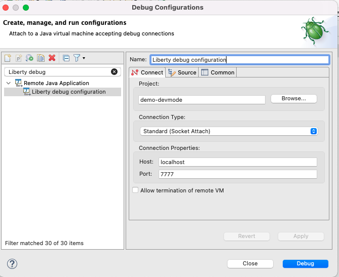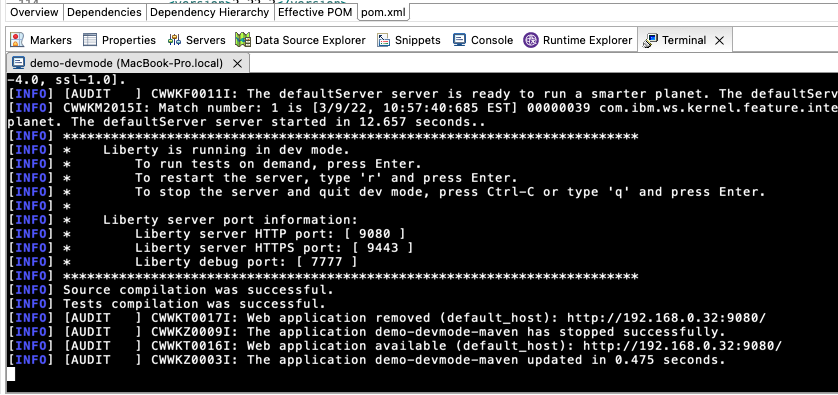 Working with dev mode in the Eclipse IDE with Liberty Developer Tools