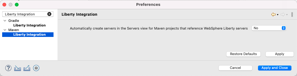 However, dev mode handles a lot of the heavy lifting for developers who use the Liberty runtime. With dev mode, you no longer need to manage your Liberty runtime instances through the Servers view of Liberty Developer Tools. You can disable the Servers view from the Liberty Developer Tools Preferences menu. Disable Liberty Developer Tools' integration for Maven and Gradle projects: