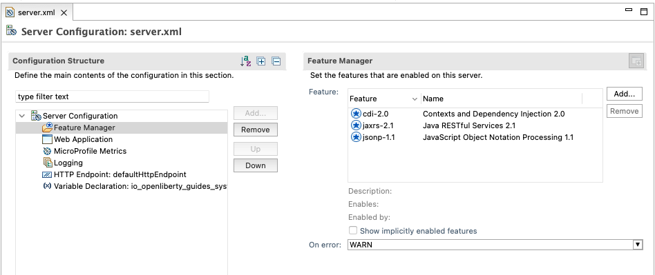 If you have Liberty Developer Tools installed in your Eclipse workspace, the server configuration editor views are helpful as you modify your server.xml and other configuration files. You can easily add new server configuration elements and features to your server.xml file.