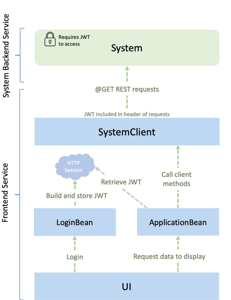 You will be working with two services, a frontend service and a secure system backend service. The frontend service logs a user in, builds a JWT, and makes authorized requests to the secure system service for JVM system properties. The following diagram depicts the application that is used in this guide: