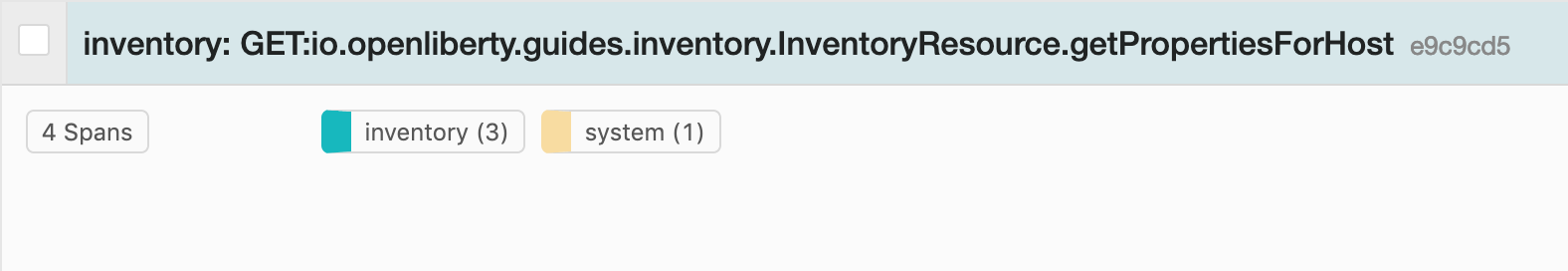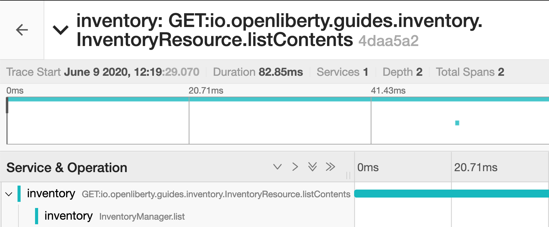 You see a new trace record that is two spans long. One span is for the listContents() JAX-RS endpoint method in the InventoryResource class, and the other span is for the list() method in the InventoryManager class.