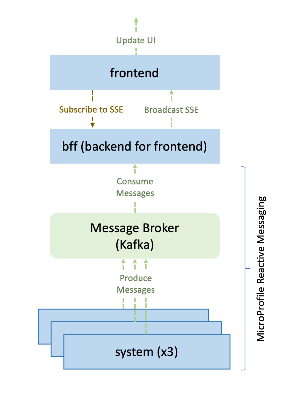 The application that you will build in this guide consists of a frontend service, a bff (backend for frontend) service, and three instances of a system service. The system services periodically publish messages that contain their hostname and current system load. The bff service receives the messages from the system services and pushes the contents as SSE to a JavaScript client in the frontend service. This client uses the events to update a table in the UI that displays each system’s hostname and its periodically updating load. The following diagram depicts the application that is used in this guide: